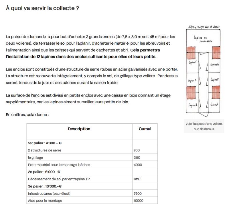 Je cherche des partenaires financiers pour aider à l'installation de 2 volières à lapins.